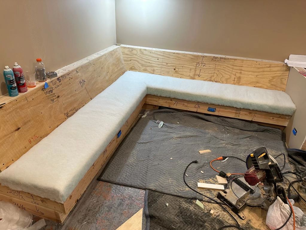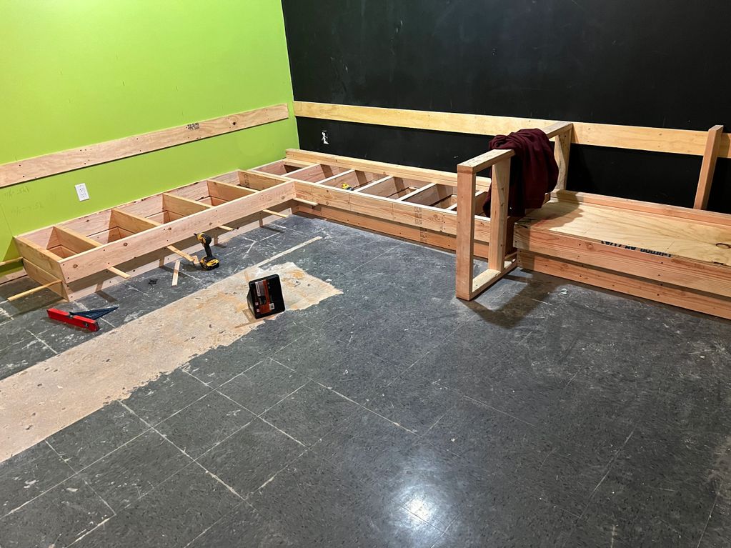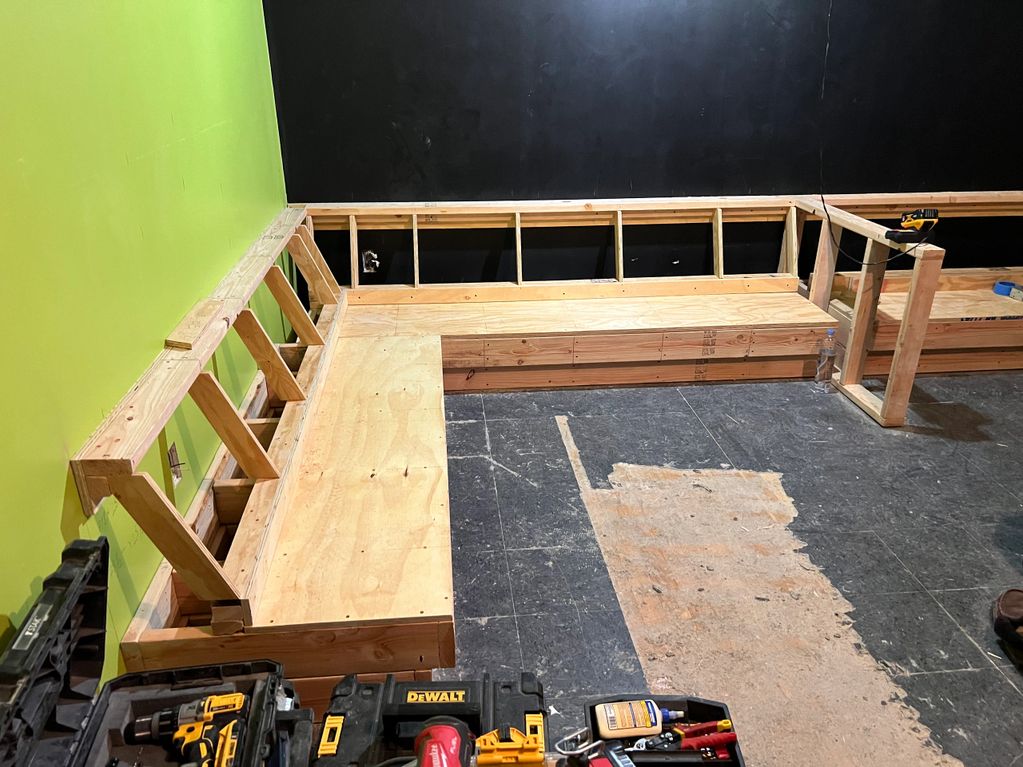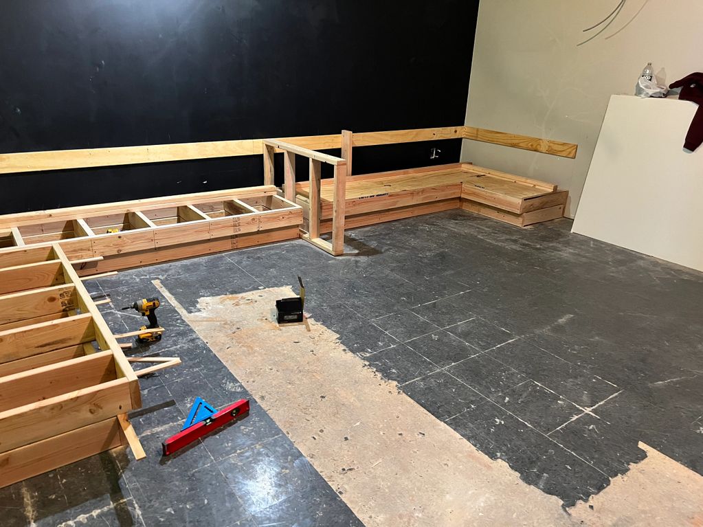 This project transformed a bright kids’ playroom into a calm, multipurpose lounge for building residents. The goal was to create a comfortable, grown-up space where people could relax, read, work quietly, or meet with friends. We designed and built custom L-shaped banquette seating that anchors the room, adds plenty of seating, and fits seamlessly with the new finishes and lighting.