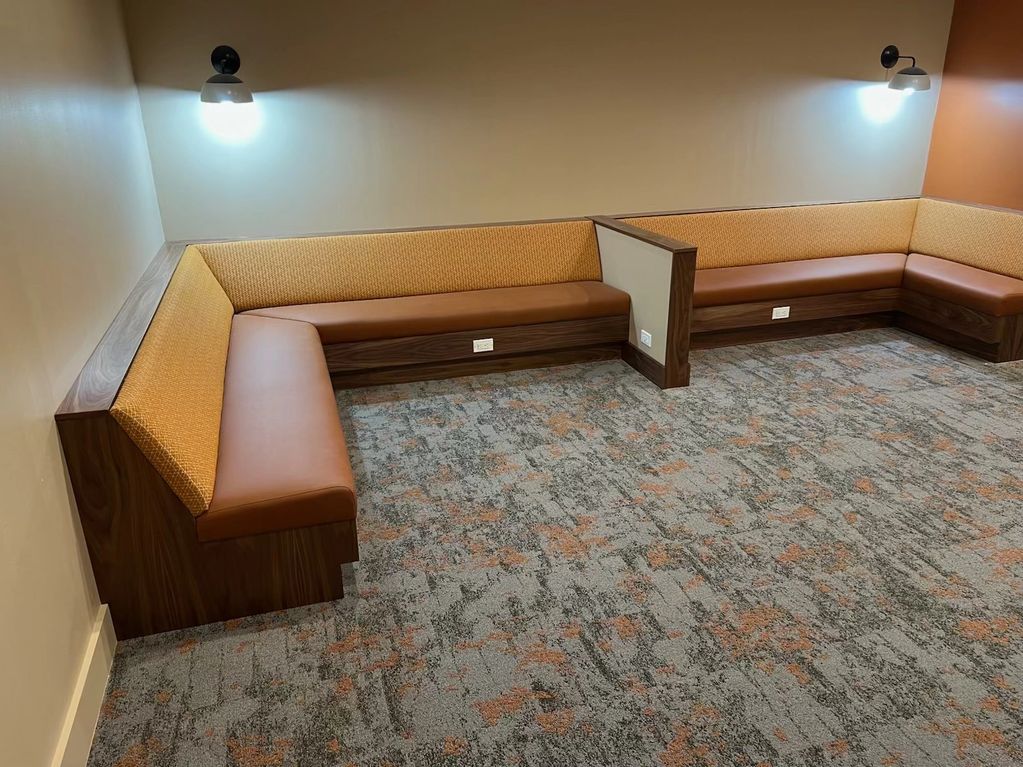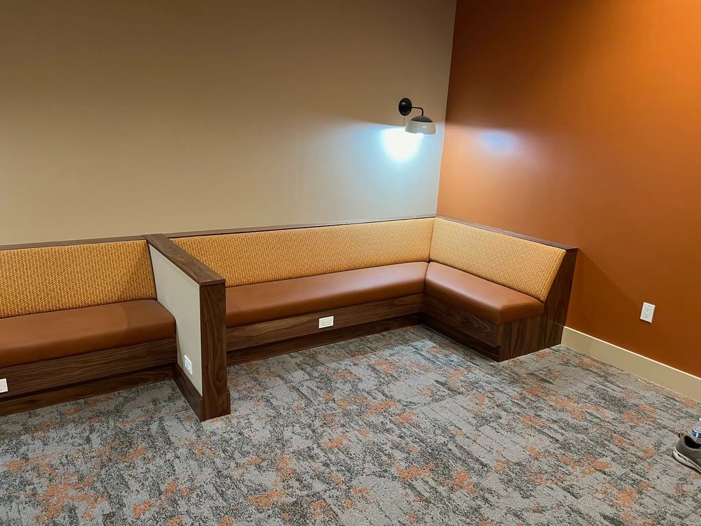 The former playroom is now a quiet, comfortable lounge that residents can use. The custom banquette seating provides generous, durable seating along the perimeter while keeping the center of the room open and flexible. Warm wood tones, coordinated upholstery, and integrated power outlets give the space a polished, hotel-like feel that significantly elevates the building’s common-area amenities.
