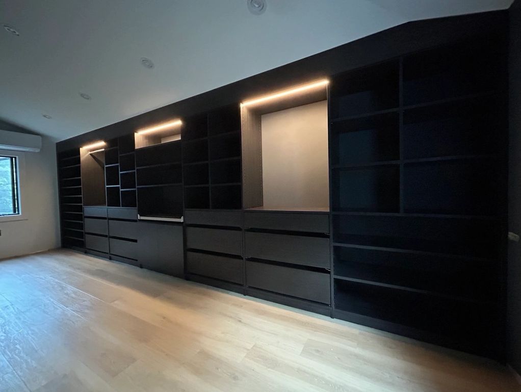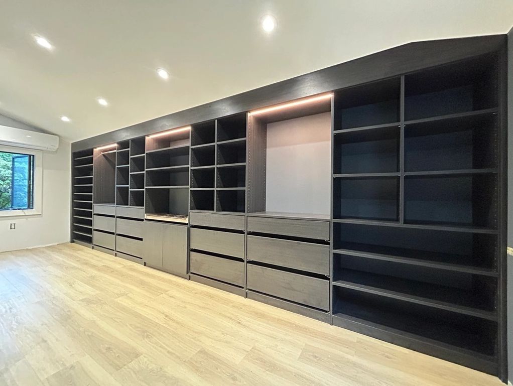 We designed and installed this full-wall custom built in to create a clean, modern storage system with a true furniture grade finish. The unit features a mix of open shelving and deep drawers for organized, hidden storage, along with recessed display niches that add depth and make the wall feel intentional not just functional.