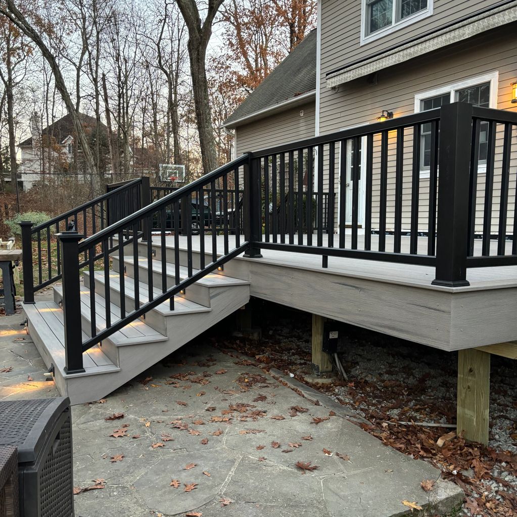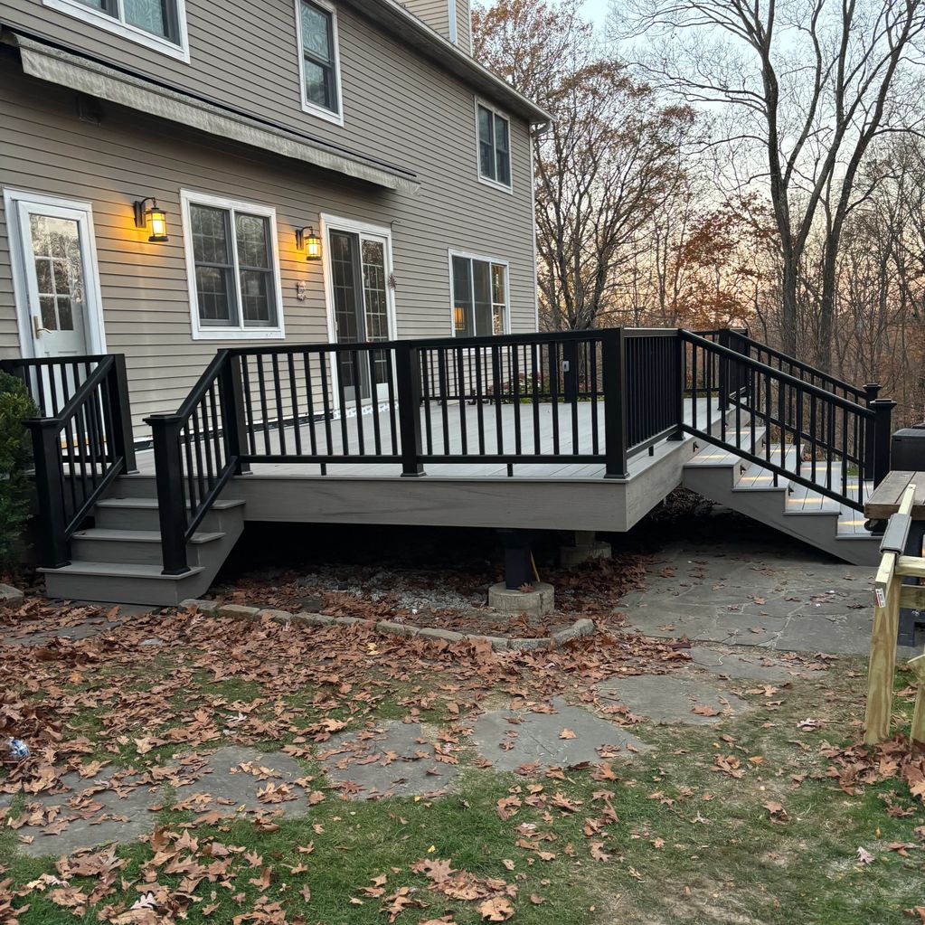 To complete the project, we installed sleek black railing around the perimeter for safety and a modern contrast, and built matching stair sets on both sides for easy access to the yard. We also made sure the new porch tied in neatly to the existing patio/walkway, with crisp lines, solid structure, and a professional finish throughout.