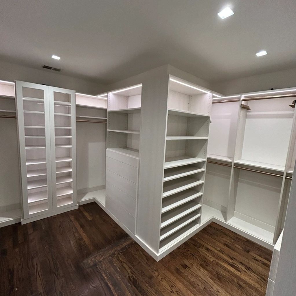 We built this custom walk in closet with a clean, built in look and a layout that maximizes every wall. Using paint grade cabinetry and adjustable shelving, we created dedicated zones for folded items, shoes, and long-hang storage, with continuous hanging rods for easy organization.